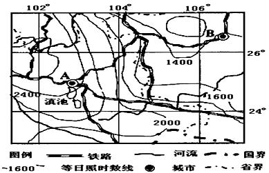 (1)图中A城市与B城市日照数相差约为 ?(小时),(2分)