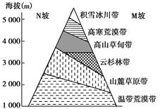 本题解析: 小题1:该山脉位于90°E附近且基带为温带荒漠带,则必然位于我国新疆地区,该山海拔达5 000米以上,可能为天山。干旱区山地森林带分布在水分条件较好的山坡,M坡有云杉林、而N坡无森林带,说明M坡水分条件较好,则M坡为迎风坡和阴坡(即北坡)。 小题2:依上题分析,N坡处于背风坡而水分条件较差,故无森林带分布。