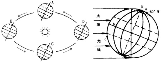 (1)上图右所示的状态处于左图地球公转中________点的位置。(填字母)
