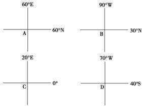 2、单选题 下图为世界四个地点的坐标,据此分析并回答题。