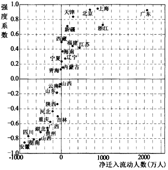 省际间的人口迁移流动往往是双向流动,既有迁出,也有迁入,净迁入流动人数是迁入人数与迁出人数之差。净迁入流动人数与迁移流动人数之比称为人口迁移流动强度系数。下图示意2000~2010年我国省际人口迁移流动强度系数与净迁入流动人数。
