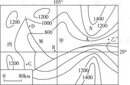 本题解析:本题考查等高线地形图的综合分析。(1)图示甲处等高线周高中低,判断为盆地。N处等高线符合“凸低为高”,判断为山脊。(2)大坝应建于峡谷地带,工程量小,且上游为盆地,蓄水量大。(3)图示乙处位于等高线600---800之间。(4)根据经纬度位置判断该地位于我国南方亚热带地区,故适宜种植亚热带常绿阔叶林。