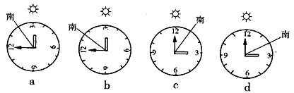 4、单选题 北京时间下午3时,某学校(40°N,105°E)地理兴趣小组借助太阳的位置用手表确定正南方向(表面朝上)。下图所示四种方法中正确的是( )