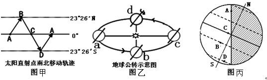 (4)图丙中阴影表示夜半球,这种现象可能出现在图乙中 位置,图中A、B、C、D四点中,地球自转线速度最大的是 ,昼长最短的是 ,在一年中昼夜长短变化最小的是 。