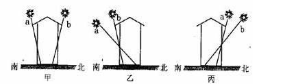 1、单选题 甲、乙、丙三幅图所示的是地处不同纬度的三座房屋二至日时的阳光照射情况(a或b)。读图,回答题。