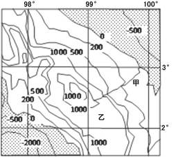 【小题1】读图可知,根据图中经纬度位置可知,该地区位于苏门答腊岛,以热带雨林气候为主,故甲河的主要补给水源为大气降水。