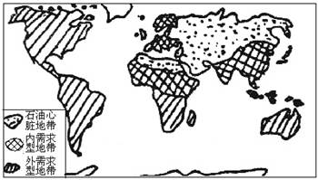 本题解析:考查阅读图示和材料的能力。从图中可以看出中东、北非、俄罗斯处于石油心脏地带。美国经济发达,石油需求量大,中东石油质优价廉,掠夺海外石油资源是美国等发达国家的战略方针。所以,美国被列入“外需求月型地带”。从图中看,我国位于“内需型”及石油心脏地带。我国需要增加油气资源,加强与其他地区的合作,建立石油战略储备基地,开发替代能源,建立节约型社会。