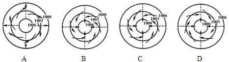 3、单选题 图中能正确表示北半球气旋的是(单位:百帕)