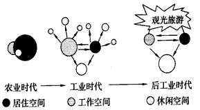 3、单选题 ? 人们日常活动空间,大体可分为居住、工作、休闲三类,每一类活动的空间规模与当地社会经济的发展息息相关。下图表示从农业时代、工业时代向后工业时代演化过程中,居住空间、工作空间、休闲空间的变化情况,读图,完成(1)——(2)题。