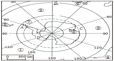 1.图中的海洋①是2.我国南极科学考察站⑦