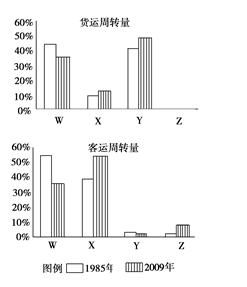 2、单选题 下图是我国公路、水运、铁路、民航分别在1985年、2009年货运周转量与客运周转量所占百分比示意图。据此判断题。