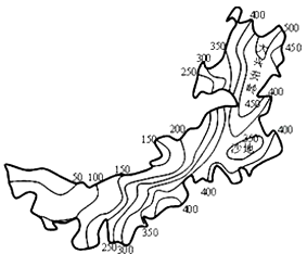 【小题1】根据等值线的递变规律,沿某一递增或递减的顺序变化。读图分析,沙地年降水量数值可能是300-350mm之间,A对。