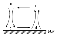 ①风暴潮 ②地震 ?③狂风 ④暴雨 ?⑤沙尘暴 ⑥洪涝 A.①②③⑤ B.③④⑤⑥ C.①③④⑥ D.①②③⑤ 参考答案: 本题解析: 本题难度:简单 3、综合题 下图为我国10月29日20时-30日20时全国降水量预报图,读图回答。(16分) 参考答案: 本题解析: 本题难度:一般 4、单选题 图中气流运动是由热力原因引起的a、b、c、d四点气压由高到低排列正确的是 参考答案:B 本题解析:本题考查热力环流。由于地面冷热不均而形成的空气环流,它是大气运动最简单的形式。受热地区近地面气压低,受冷地区近地面气压高,高压处等压面向上凸起;低压处等压面向下凹陷。b点气压最高,d点气压大于b点。a点气压最低,c点气压高于a点。所以本题选择B选项。 本题难度:一般 5、单选题 读古诗:“五月炎蒸气,三时刻漏长。夏随风里热,梅逐雨中黄”,据此回答小题。 |