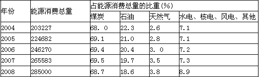 本题解析:(1)由表中2004-2008各数据变化可以判断,能源消费总量呈上升趋势;能源消费构成以煤炭为主,所占比重先上升后下降;石油所占比重呈下降趋势,而总量并没有减少;天然气所占比重呈上升趋势;水电、核电、风电、其他所占比重呈上升趋势。综上所述,错误的是A。