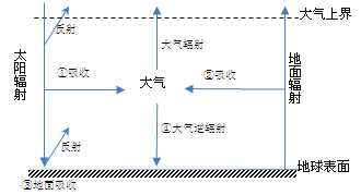 A.白天地面吸收强,夜晚①弱 B.白天反射作用强,夜晚②弱 C.白天大气辐射强,夜晚③弱 D.白天太阳辐射强,夜晚④弱 |