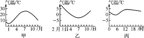 【小题2】图乙表达该地几日内的天气变化,该地在图示时间内受冷空气活动影响有一次明显的降温过程,A错、C正确。我国夏季正午太阳高度较大、昼长较长,获太阳辐射较多,气温高,B错。丙地气温日较差小,说明当地可能为阴雨天气,D错。