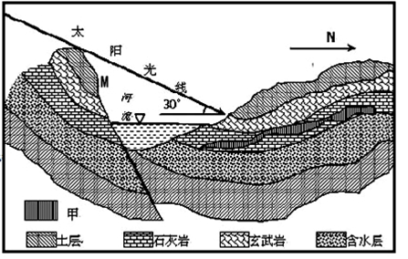 (1)图示的地质构造中,A为 ,B为 。 (2)甲、乙两处的山地都是在 (流水、风力)的 (侵蚀、沉积)作用下形成的。 (3)①、②、③、④四处的岩石中属于沉积岩的是 和 ;若要开采坚硬的岩石作建筑材料,宜选择①处还是②处? 。 (4)A、B两处中,最有可能成为自流井的是 处;最有可能成为良好的储油构造的是 处。 (5)任意采伐A处山区的森林将会导致附近河流的泥沙含量 ,水旱灾害增加,甚至可能造成滑坡和泥石流等地质灾害。