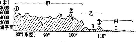 依据图中的纬度可以判断主要经过我国三级阶梯,甲是第一级,乙是第二级,丙是第三级,A地位于我国青藏高原,B地在四川盆地,C位于长江中下游,这样可以知道沿线的山脉与喜马拉雅山脉,横断山脉和巫山,C地位于我国长江中下游地区是我国南方地区,粮食作物为水稻,该地农业发展中主要面临洪涝灾害与水土流失问题