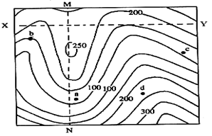 小题1:图中a、b、c、d四点中,可能形成小溪的是(?)