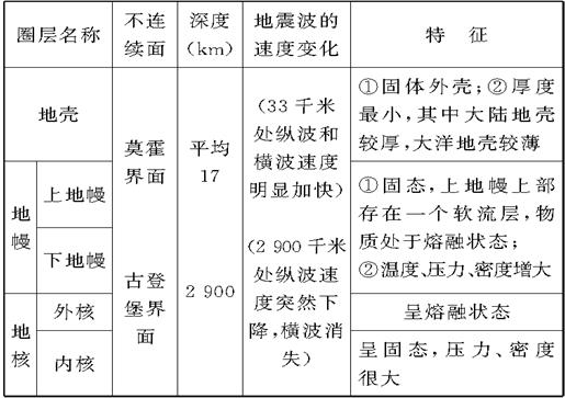 点评:本题难度适中。地球内部圈层划分的依据地震波在地球内部传播速度的变化,地球固体表面以下可划分为地壳、地幔、地核三个圈层。具体分析如下图表所示: