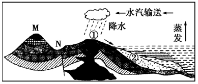 (2)根据水循环发生的领域,图中所示水循环为 循环,该水循环的重要意义有 ; 。在该水循环参与下,①处的 岩可转化为②处的 岩。