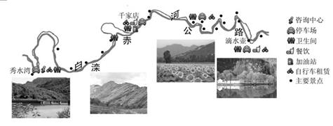 4、单选题 北京市延庆县的“百里山水画廊”,沿白河绵延112华里,沿途重峦叠嶂山势雄浑,树木花草四季变幻,令人赏心悦目。图为“百里山水画廊游览图”。读图回答题。