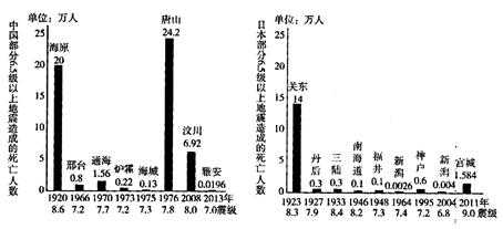 (2)简述图示时间内中日地震死亡人数差别,并分析原因。(8分)
