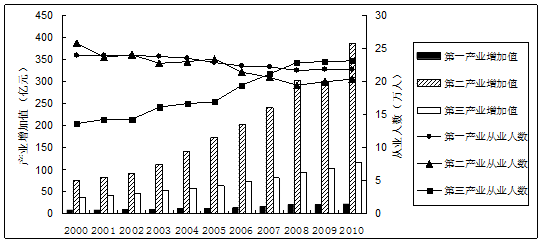 材料二:攀枝花市地形以山地为主,有全国最大、世界第三,伴生多种稀有金属的钒钛磁铁矿,是著名的钒钛之都。2010年该市启动了钒钛产业园规划,重点发展钢铁、钒、钛原料、钛白粉、金属钛及伴生产业。 材料三:攀枝花市2000-2010年三大产业统计资料(数据来源:攀枝花市统计局)。