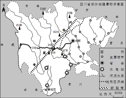 本题解析: (1)根据图中各个城市的位置、相对位置和空间分布,城市主要分布在断裂带的东部,河流的中下游地区,因而可推出图中四川省城市分布的基本特征是东多西少,沿河分布。 (2)图中318国道四川段沿途景色壮美,从成都平原往西进入西藏青藏高原,乘车此段可强烈感受到垂直自然带的差异,此路段地势起伏大,夏季多暴雨,常面临滑坡(崩塌)、泥石流等地质灾害的威胁。 (3)水电开发自然条件主要从河流流量和落差两大方面,社会条件主要从人口、技术、交通和市场等方面来分析,川西地区河流流量大,河床落差大,水力资源丰富;水系众多,峡谷多,适宜梯级开发;人口分布少,建站动迁居民少;但地质条件复杂,多断裂带;高山峡谷,交通不便,给物资运输与后勤保障带来困难。 (4)根据攀枝花市2000-2010年三大产业统计资料图,第二产业增加值最大,可知目前,攀枝花的主导产业是第二产业,第三产业从业人数最多,因而对就业贡献率最大的是第三产业。 (5)从可持续发展的角度为攀枝花市钒钛产业园规划与建设提出合理建议主要从能源消费、资源利用率、延长产业链、基础设施建设和环境保护等方面,提高清洁能源的消费比重,加大科技投入,设计和采用先进工艺设备,提高资源利用率,改善环境质量,推进产品深加工,延长产业链,提高经济效益。 考点:该题考查中国区域地理,重点考查自然灾害、城市、工业的区位和区域经济发展。