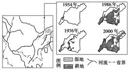 本题解析:1.湿地的形成原因。一、气候因素中气温低,蒸发小;二、地势低平,排水不畅;三、多冻土,下渗困难,降水丰富等。选择C项。 2.从图中信息可知,耕地面积增加,湿地面积减小。选择B项。 3.根据图中信息可知,耕地面积增加,湿地面积减小,所以是过度开垦导致湿地减少。选择A项。