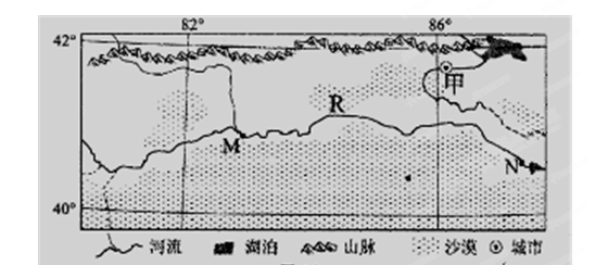 | (1)分析甲地种植香梨的有利自然条件。(4分) (2)说明R河自M流向N的过程中流量变化的特点及自然原因。(4分) (3)说出该区域1973~2005年土地利用结构的变化特点,并说明其对生态环境的影响。(5分)
