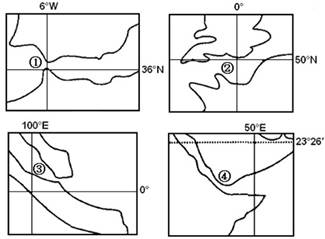 2.由小题1判断此时节气为北半球的冬至,由于陆地上的气温比海洋的气温低。因此陆地等温线向南凸。