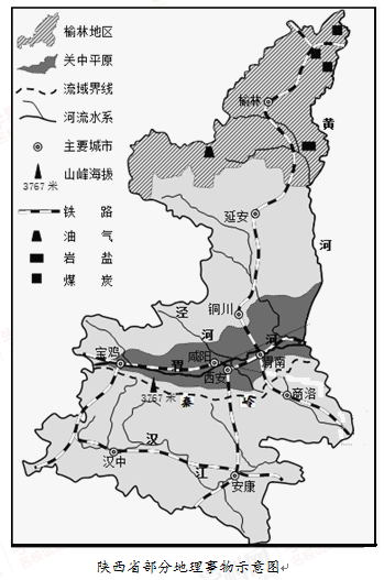 3、综合题 陕西省资源丰富,环境独特,是我国西部大开发的重点区域之一。读“陕西省部分地理事物示意图”回答问题。(18分)