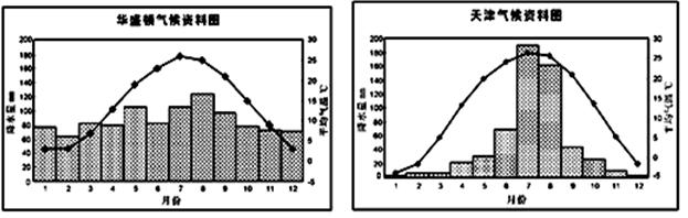 材料二?天津(39?6?N,117 ?10?E)、华盛顿(38?51?N,77?02?W)气候资料统计图