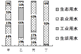 5、单选题  图为2008年我国甲乙丙丁四个省级行政区的用水结构图。读图回答问题。