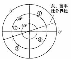 【小题1】已知甲地(32°N,120°E)和乙地为对趾点,对趾点的经度合是180°,纬度南北纬相对,数值相同,所以对趾点乙是32°S,60°W。读图,东西半球分界线是20°W和160°E,结合图中0°经线判断,图示为南半球图,呈顺时针方向自转。根据经纬度判断,①点30°S,60°W,最接近乙地,A对。②点、③点、④点经度明显相关较多,B、C、D错。