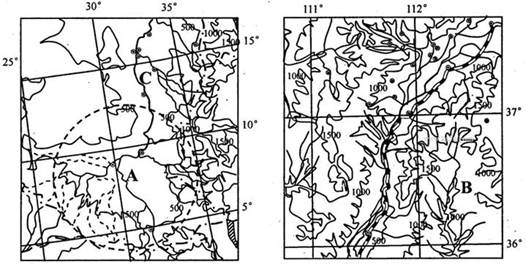 (1)从等高线近于闭合,数值中间小周围大,且水系呈向心状,可知A地区地势周高中低,地形类型为盆地。从经纬度和千沟万壑的地表形态可以判断出B地区位于黄土高原,黄土地貌广布。黄土层是风力堆积作用形成的,而千沟万壑的地表形态是流水侵蚀作用形成的。