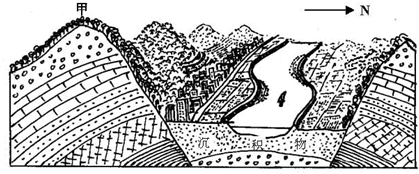 4、单选题 读图回答甲处的地质构造的形成及其上部缺失的地质过程是:( )