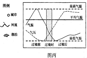 (2)隆冬时节图甲、图乙两区域均可受到图丙所示天气系统影响,简述在该天气系统影响下的天气变化过程。