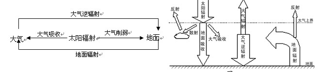 太阳辐射是地球上最主要的能量来源。大气的受热过程可以用图1-5或图1-6表示,在此过程中大气对太阳辐射具有削弱作用,对地面具有保温作用。大气对太阳辐射进行吸收、反射、散射,从而使到达地面的能量大为减少。大气的吸收具有选择性,臭氧和氧原子主要吸收紫外线;水汽和二氧化碳主要吸收红外线,而可见光的绝大部分可以到达地面。