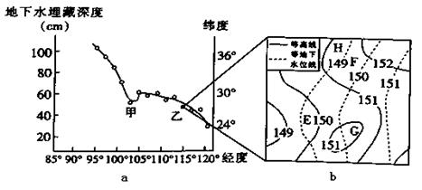1.图a中的曲线在甲地出现明显的较低值,反映出此处2.乙区域要对E、F、G、H四个区进行绿化,选择了4种植物进行种植,测得4种植物的根深见下表,假设根部不能达到地下水位,植物就会因为缺水而死亡。以下叙述正确的是