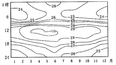 4、单选题 下图为“某地一年中气温日变化的分布图”(单位:℃),读图完成下列问题。