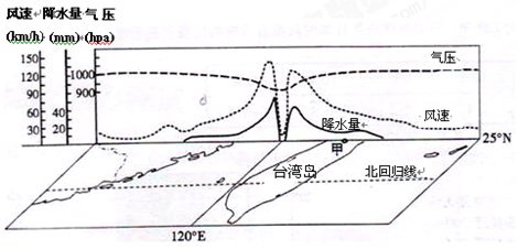 【小题1】读图可知,天气系统为台风,北半球为逆时针辐合;甲地位于台风东部,近地面风向为东南风;风速最大区域气压值约为950hpa,气压最低区域降水量为零。