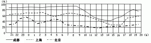 5、单选题 下图是北京、上海、成都三个城市的4月5日21:00~4月6日20:00相对湿度(实际水汽量与相同温度下可能达到的最大水汽量之比)的变化图,回答1—3题。