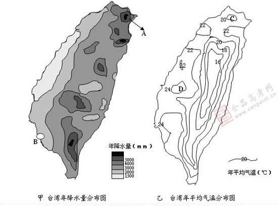 1.甲图中A处为我国的“雨极”所在地,这里多雨的原因分析不正确的是2.甲图中B处是台湾著名的海盐生产基地,该地制盐业发展的有利自然条件是