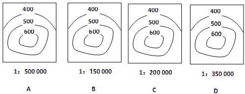 【小题1】仔细比较四副图可知,四图的图幅、等高距、等高线疏密程度都基本相同,只有比例尺不同,而且大小关系为B>C>D>A,根据坡度与比例尺的关系可知在等高距、图上距离相同时,比例尺越大,坡度越陡,故选项B正确。