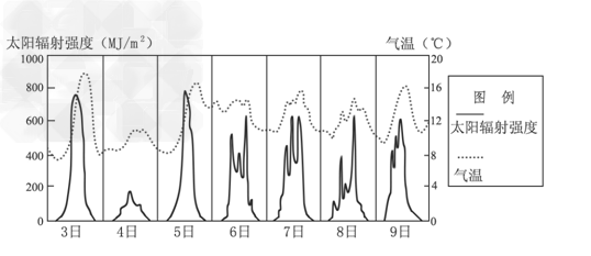 3、单选题 下图示意南半球中纬度某平原地区某月3 ~9 日的气温与太阳辐射强度变化情况, 读图回答1 ~2 题。