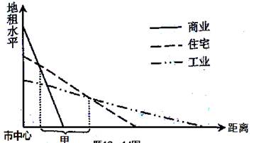 本题解析: 小题1:城市土地利用主要取决于各种活动的付租能力,付租能力高的活动取得土地的使用权。故选D。 小题2:因甲范围中,住宅的付租能力最高,而商业区、工业区和农业区的付租能力低,所以该范围内形成住宅区。故选B。