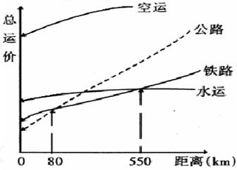 (3)图中四种运输方式中,随运距增加而增加最快的的运输方式是?,随运距增加而变化不大的是?。这种情况说明:?。(3分)