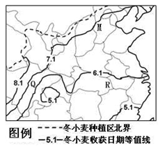 1、图中地形的大致走向是 [? ] A.南北 B.东西 C.东北—西南 D.西北—东南 2、站在图中最高峰观测不到的地点是 [? ] A.甲 B.乙 C.丙 D.丁 3、若该地位于华北地区,则四地中植被生长得较好的是 [? ] A.甲处 B.乙处 C.丙处 D.丁处 3、单选题 读下图“我国东部冬小麦种植区内收获期等值线图”,近年来有多位欧美气候学家推断在未来20 ~30年间,地球将经历一个相对气温偏低的“微型冰河世纪”。假定这一推断成立,据此回答下列各题。 |